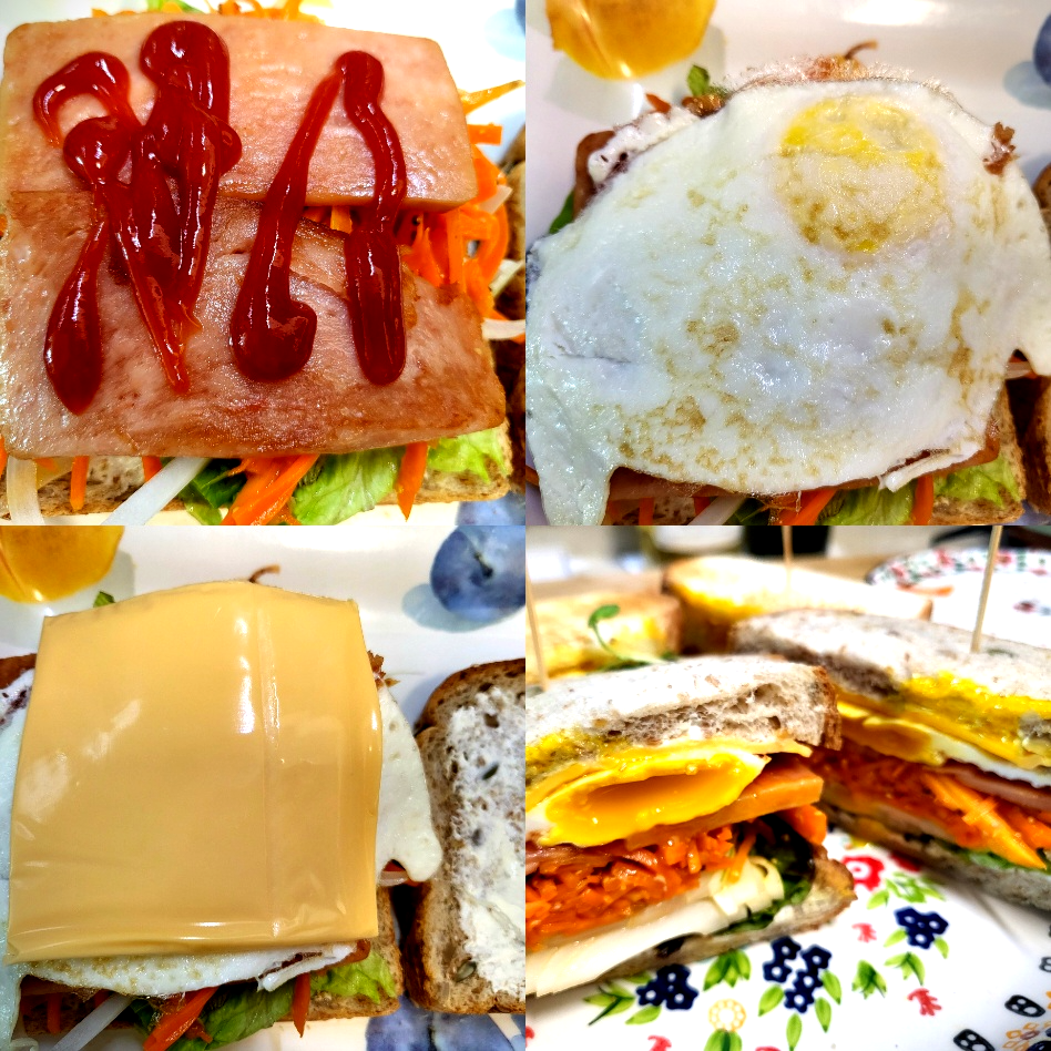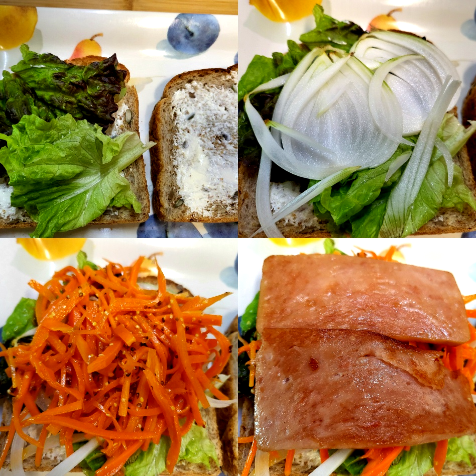 - 상추, 채썬 양파, 당근라페, 스팸햄, 케찹, 계란후라이, 치즈 순으로 올려줍니다.
