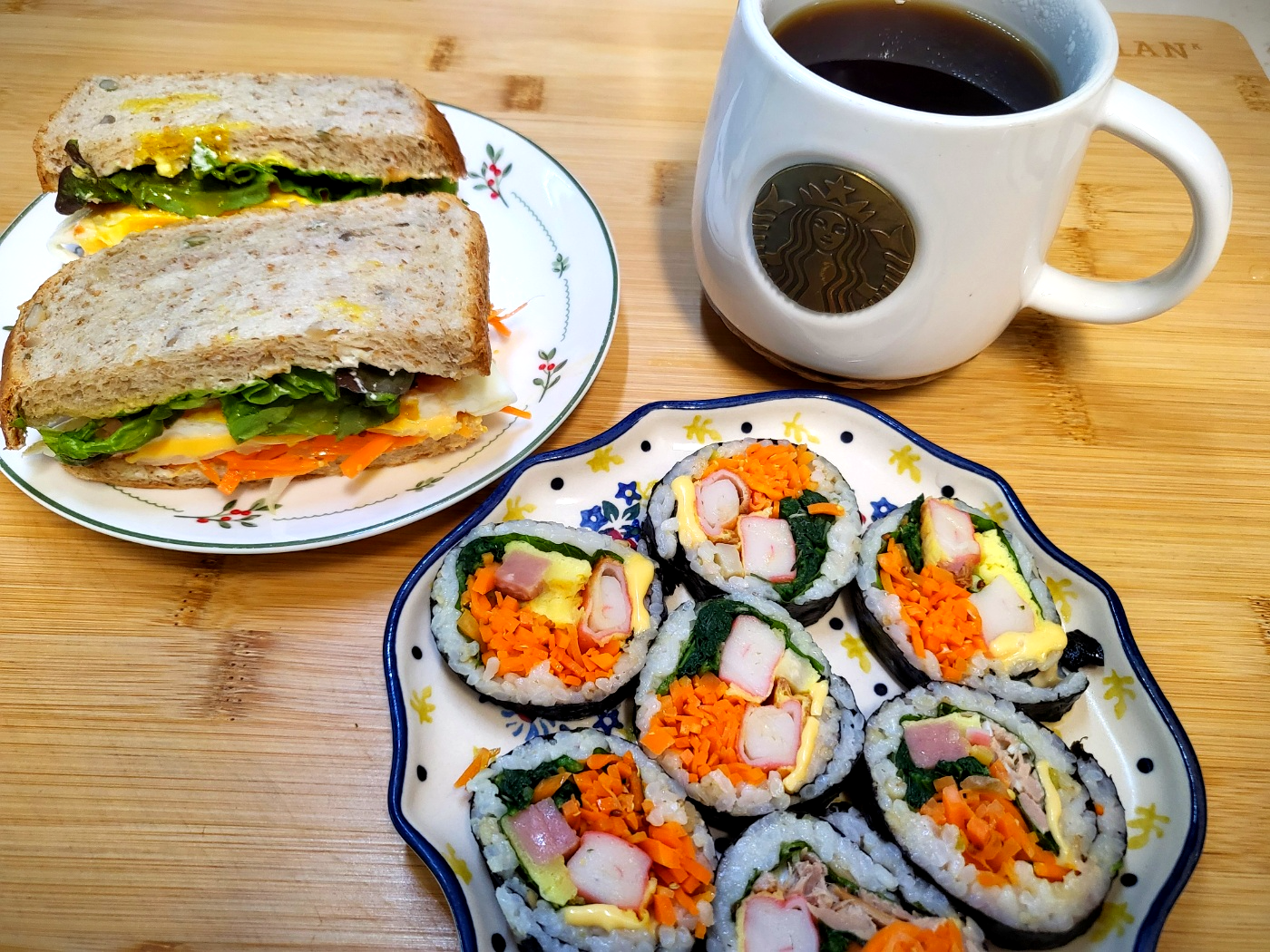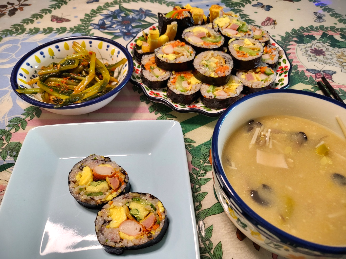 - 다양한 재료로 김밥을 말아 완성합니다. 이렇게 만든 김밥은 든든한 한끼로 손색이 없어요.