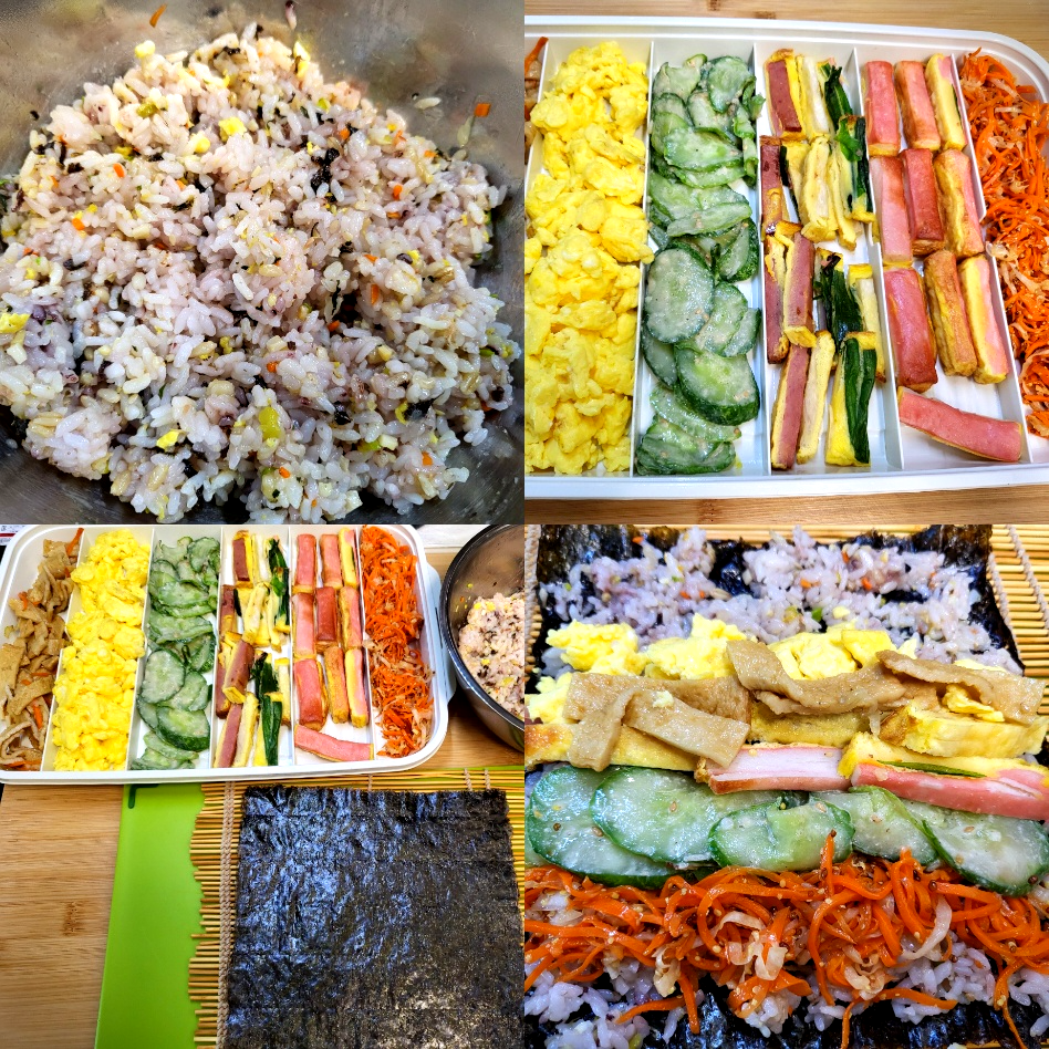 - 냉동실에 있던 오미산적과 냉장고에 있는 반찬들을 활용해 김밥 속 재료를 올려줍니다.