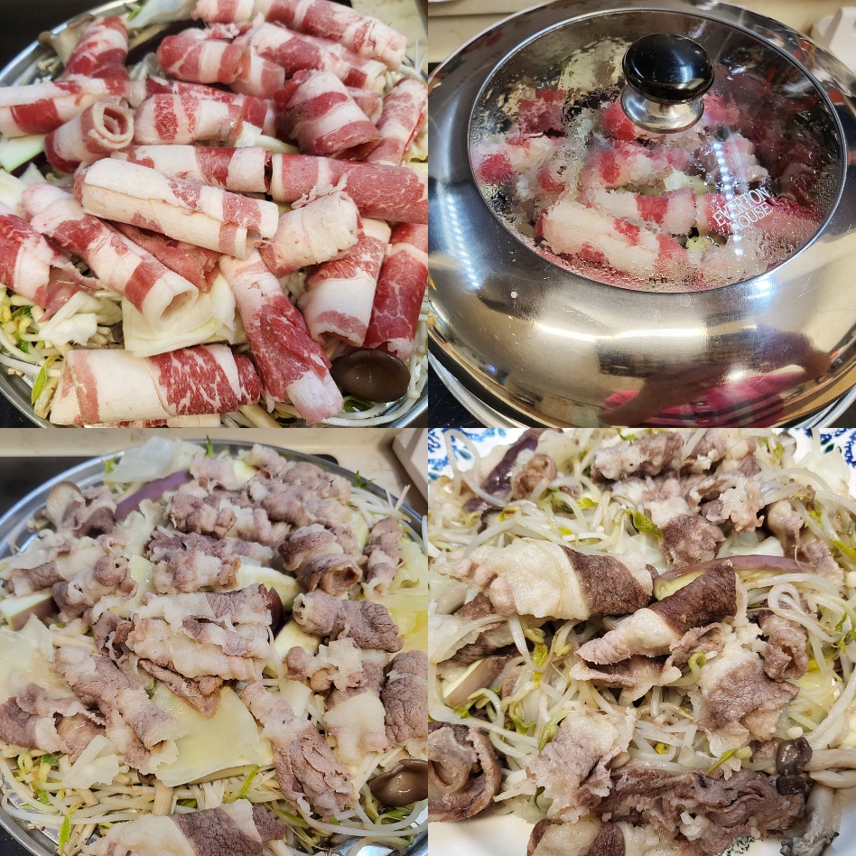3. 우삼겹 올리기: 핏물을 제거한 우삼겹을 빈틈없이 올린 후 뚜껑을 닫고 10분간 쪄줍니다.