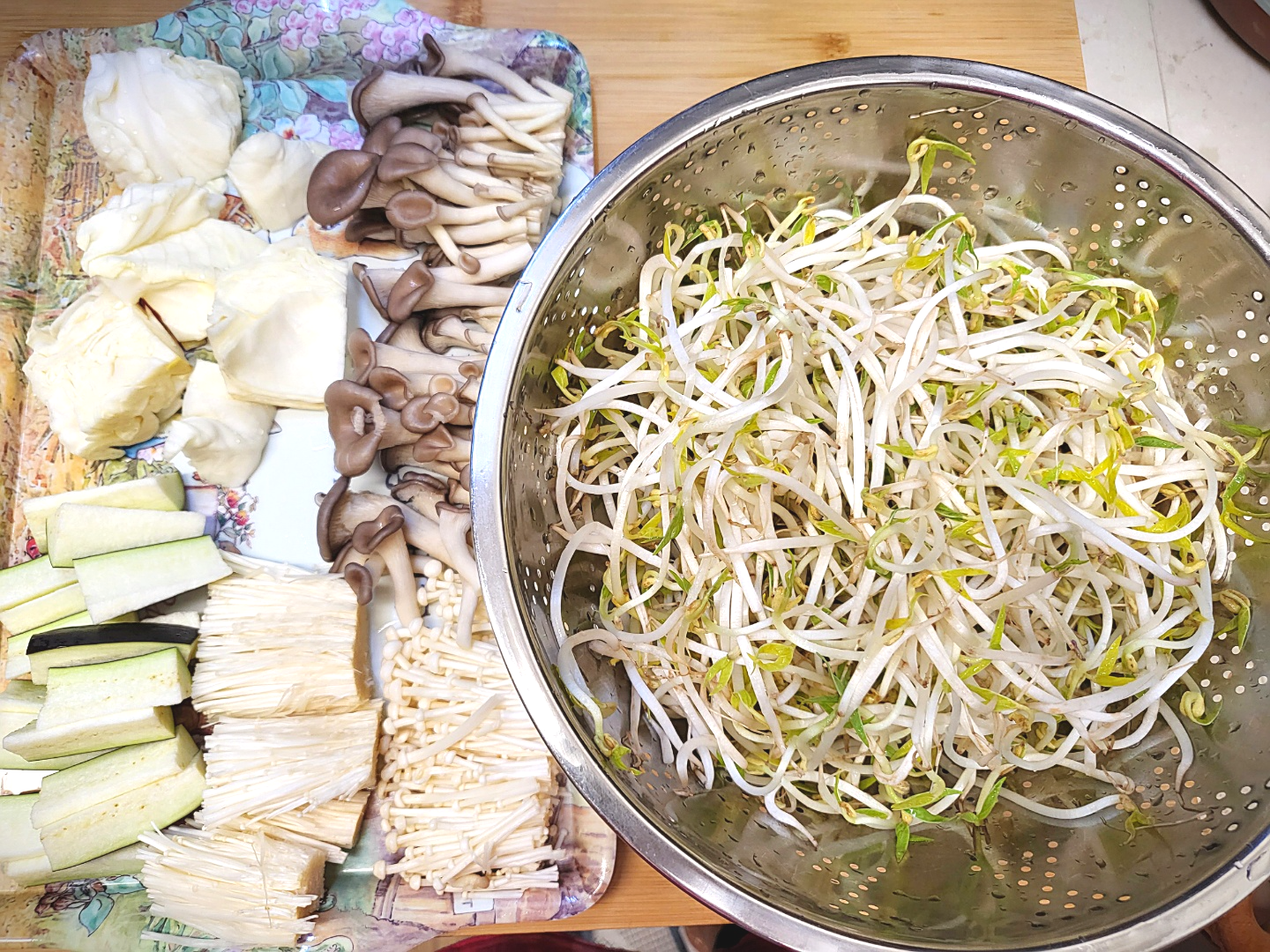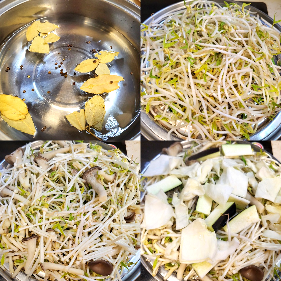 - 야채 쌓기: 숙주를 먼저 올리고, 팽이버섯과 느타리버섯을 올립니다. 썰어둔 가지와 양배추 등 냉장고 속 야채들을 차례로 쌓아줍니다.
