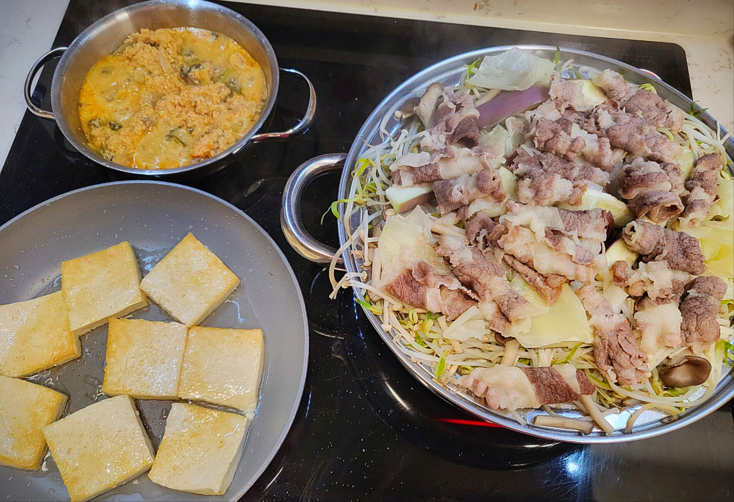 - 두부 구워주기: 우삼겹이 익는 동안 두부를 구워 준비합니다.